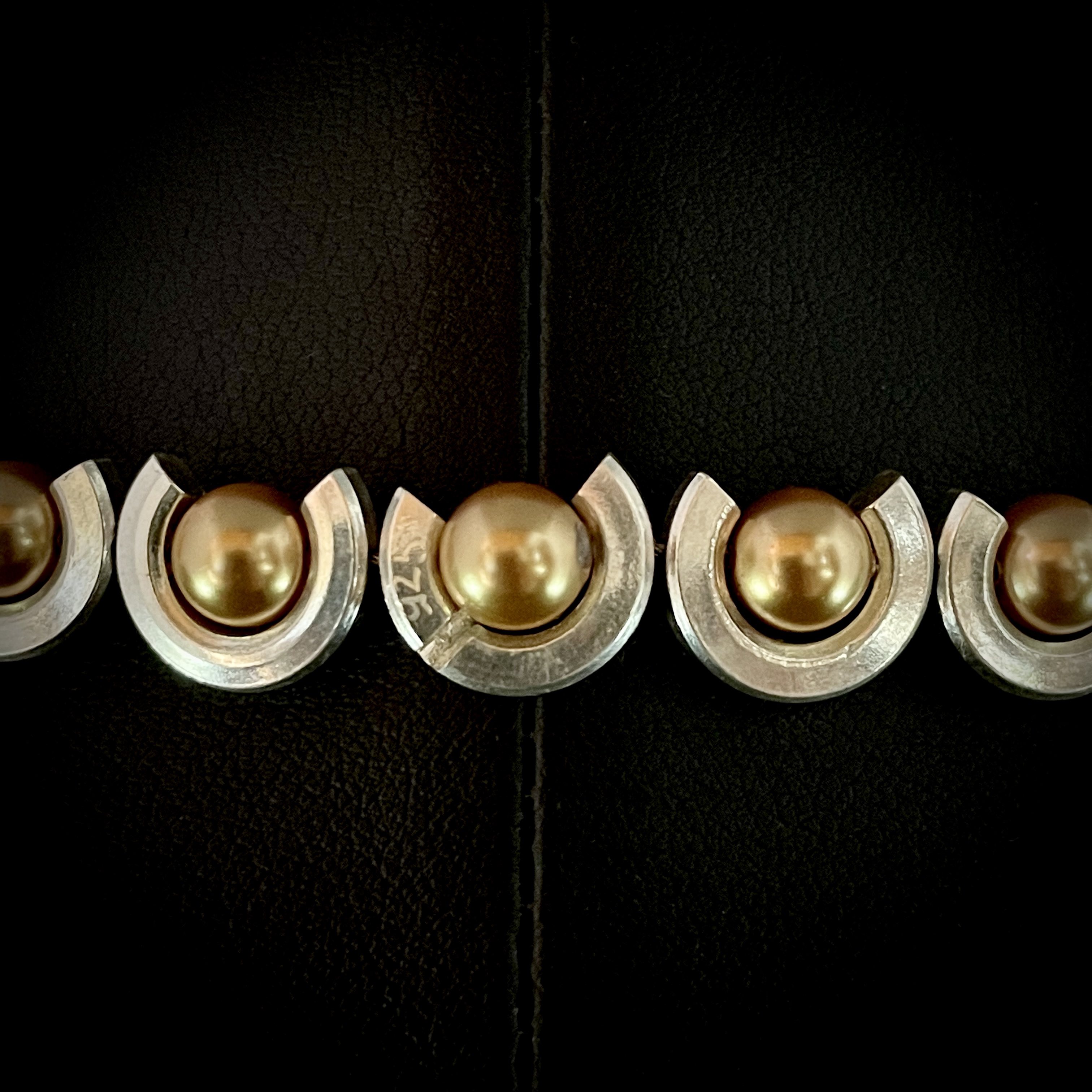 Exquisite necklace made of thirty six Swarovski crystal pearls, each surrounded by silver semi-rings.
